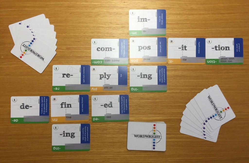 Wordwright has a variety of games you can play with the deck offered, but the base concept from which all of those game types is simple: the deck is composed of roots, prefixes, and suffixes, and players are rewarded for stringing those together into words.