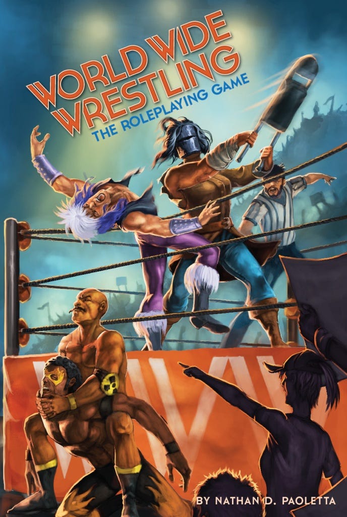 I was between this and third edition Shadowrun, but I had to pick World Wide Wrestling. The complete ridiculousness of every wrestler in frame, the action, the impact you feel from that folding chari, plus the silhouette of the woman in the crowd. "Look, Greg, Johnny Atomic is choking out the Human Flame! And Iron Maiden just hit Boy Stardust in the face with an electric chair! The ref looks pissed! This is awesome!" Considering the focus World Wide Wrestling puts on wrestling as a performance, rather than an actual battle, this works perfect.