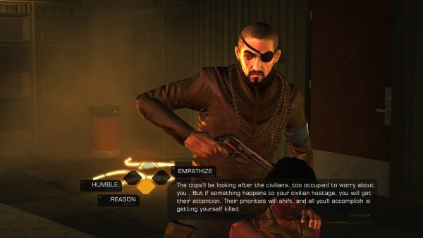 With this information, it's up to the player to use that information to try and bend the conversation in their favor. What I love about this is that the game doesn't have some sort of arbitrary "conversation" skill, like Mass Effect or Fallout. In those games, you have a somewhat arbitrary measurement of your ability to talk to people, and if that number is high enough, it unlocks the "just get everything you want" dialogue option. Human Revolution has no such measurement, and instead, if you want the best option, you need to actually reason your way around your conversational opponent.